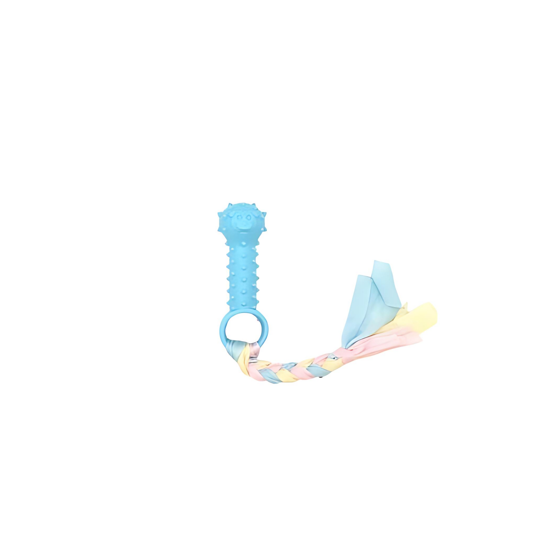 This fun, multi-texture toy features a soft yet durable blue rubber ring and bone-shaped chew piece, both designed with gentle bumps to support healthy chewing and help clean your dog’s teeth. Connected by a colorful pastel fabric braid, it’s ideal for tug-of-war, interactive play, and light chew sessions.